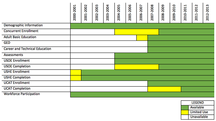 In addition to linking student records from K12 and postsecondary education to the workforce, the Utah Data Alliance can follow students across time. The following table displays the general guidelines for longitudinal data availability.